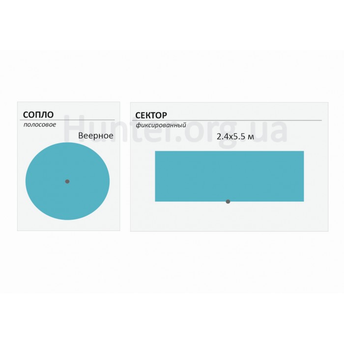 Сопла для поливу Hunter SS-918 забезпечує бічний смуговий полив прямокутника розміром: 2,7 м х 5,5 м. Колір сопла – синій.