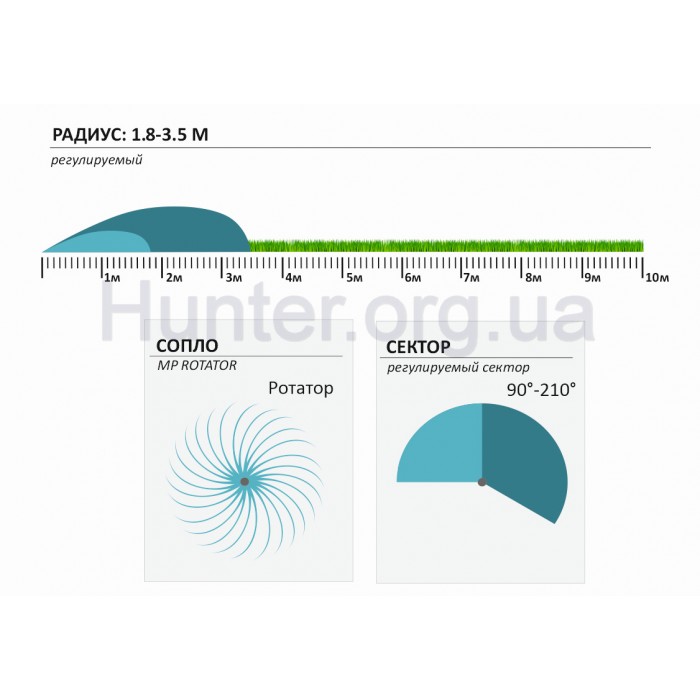Форсунки поливу серії MP800 від Hunter забезпечують підвищену інтенсивність поливу, що ідеально підходить для поливу невеликих ділянок та модернізації розпилювачів. Hunter є єдиною компанією в світі, що пропонує три моделі з висувними головками та точним налаштуванням інтенсивності поливу, що надають клієнтам розширені можливості в галузі керування орошенням. Радіус поливу для моделі MP800SR становить від 1,8 метра.