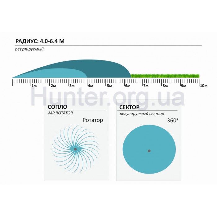 У революційному MP Rotator від Hunter застосована унікальна технологія мультитраєкторних обертових струменів, яка дозволяє зменшити витрати води, необхідні для поливу. Форсунка поливального пристрою Hunter MP Rotator не просто розпилює воду, а повільно і з постійною швидкістю подає її на ділянку декількома струменями. Повільна швидкість поливу дозволяє рівномірніше і якісніше проникнути воді в грунт на поливаній ділянці.