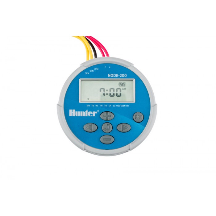 Контролер поливу Hunter NODE-200 розроблений спеціально для таких територіальних об'єктів, які не мають прямого підключення до електромережі. Цей таймер має можливість керувати відразу двома зрошувальними зонами. Працює від однієї 9-вольтової батареї. При необхідності можна поставити дві батарейки, що в свою чергу збільшить час безперебійного функціонування обладнання.